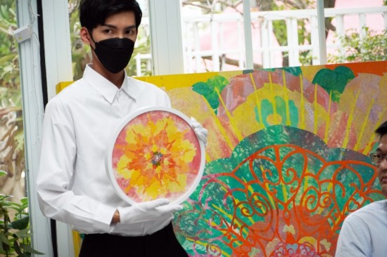 图为艺术家辜琪钧作品 雏菊系列 25x25cm 矿物颜料、木板、宣纸、swarvoski水晶、纯金箔于台北私人拍卖会