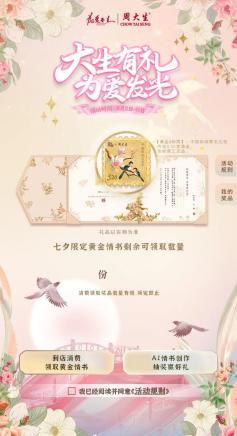 国宝定情,鸿雁传书,中国人才懂的中式浪漫。周大生联名中国邮政推出了限定版“黄金国宝情书”,内附0.01克黄金邮票,以及周大生七夕定制版鹊上心头国宝情书,将“定情”与“传情”的节日仪式感赋予更高级的浪漫。用户可以通过参与周大生珠宝公众号推文活动获得免费抽取“黄金国宝情书”的机会或通过周大生线下门店消费满3999元,免费定制黄金情书,限量9999份,领完即止。此外,活动期间,用户光临线下门店参与“鸿雁传情”活动,即可获得周大生赠送的周大生中国邮政联名的明信片并享有免费邮寄服务,收获这份属于东方独有的节日浪漫。