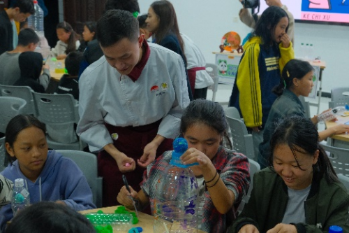 不同于可持续“李”想计划之前活动中改造李锦记废弃酱料玻璃瓶,这一次环创的物料均来自于9月李锦记希望厨师成都班开班仪式回收的矿泉水瓶、希望厨师平时用完的饮料瓶——在不弃升级再造中心设计师欧佳鹏和田星星的技术指导下,李锦记希望厨师与川兴中学50名 “珍珠生”们耗时1小时,共同完成了十余个航天环创装置。